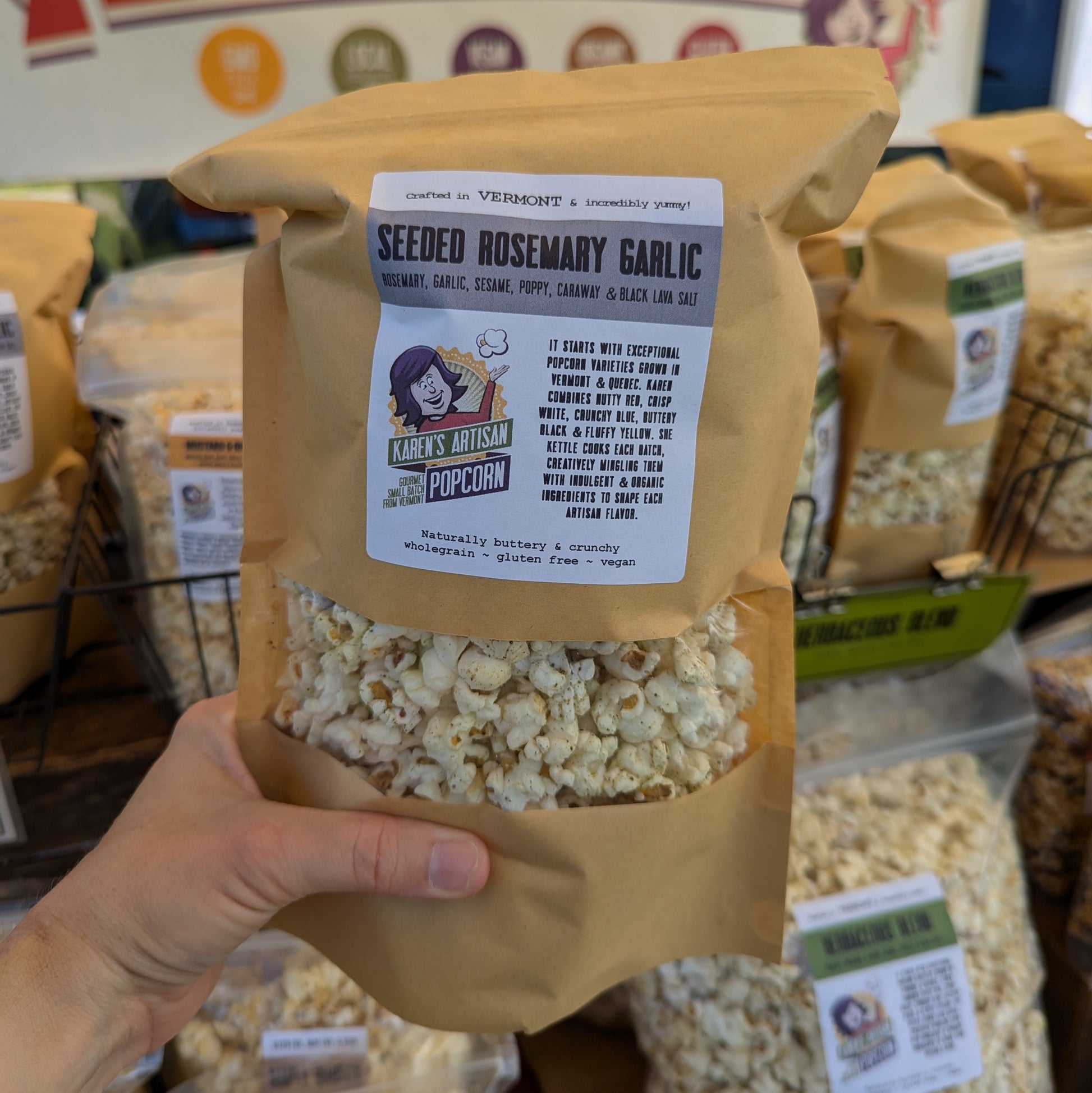 Karen's naturally buttery and crunchy popcorn topped with rosemary, garlic, poppy seeds, caraway seeds, sesame seeds & black lava sea salt