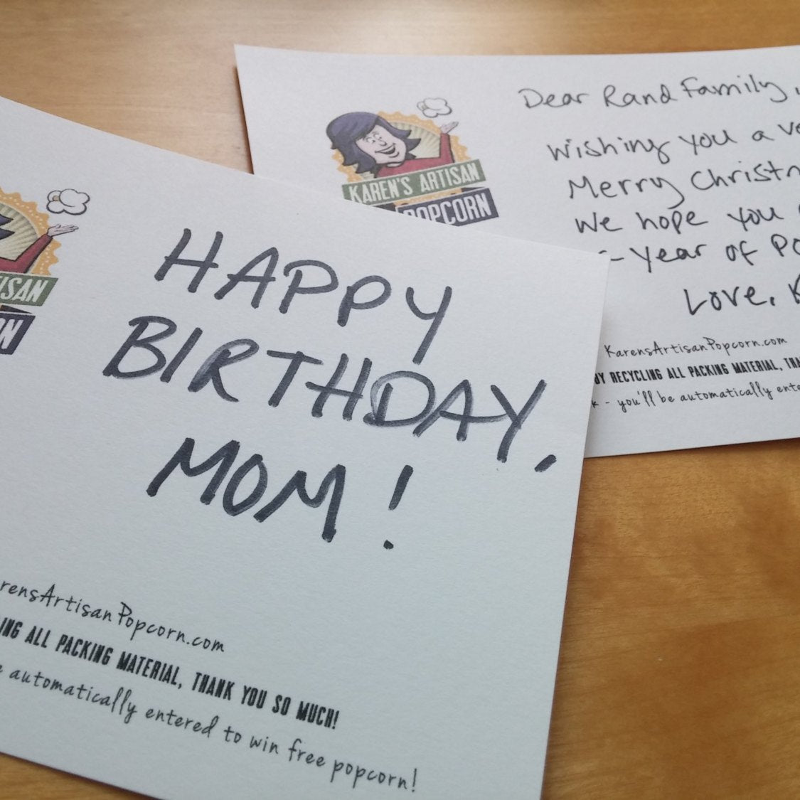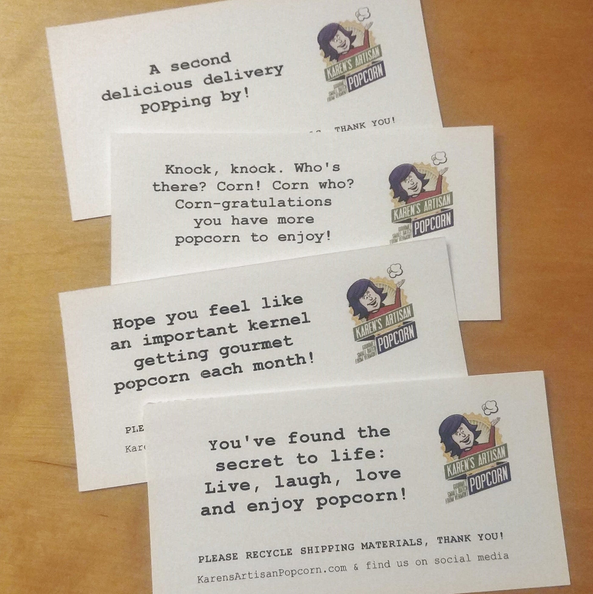 Personalize: your order. Enter a message for your gift recipient or any personalization you need to make your subscription perfect! I always include a "Welcome to the Gourmet Popcorn Kernel of the Month Club!" card in the first shipment, so your recipient knows more popcorn is on the way. I can email you a printable gift announcement card ahead of time if you need. Each future shipment will include a fun popcorn pun card. I lightly gift wrap each initial shipment, but if you'd like a full gift wrapping option, please add that to your cart.
