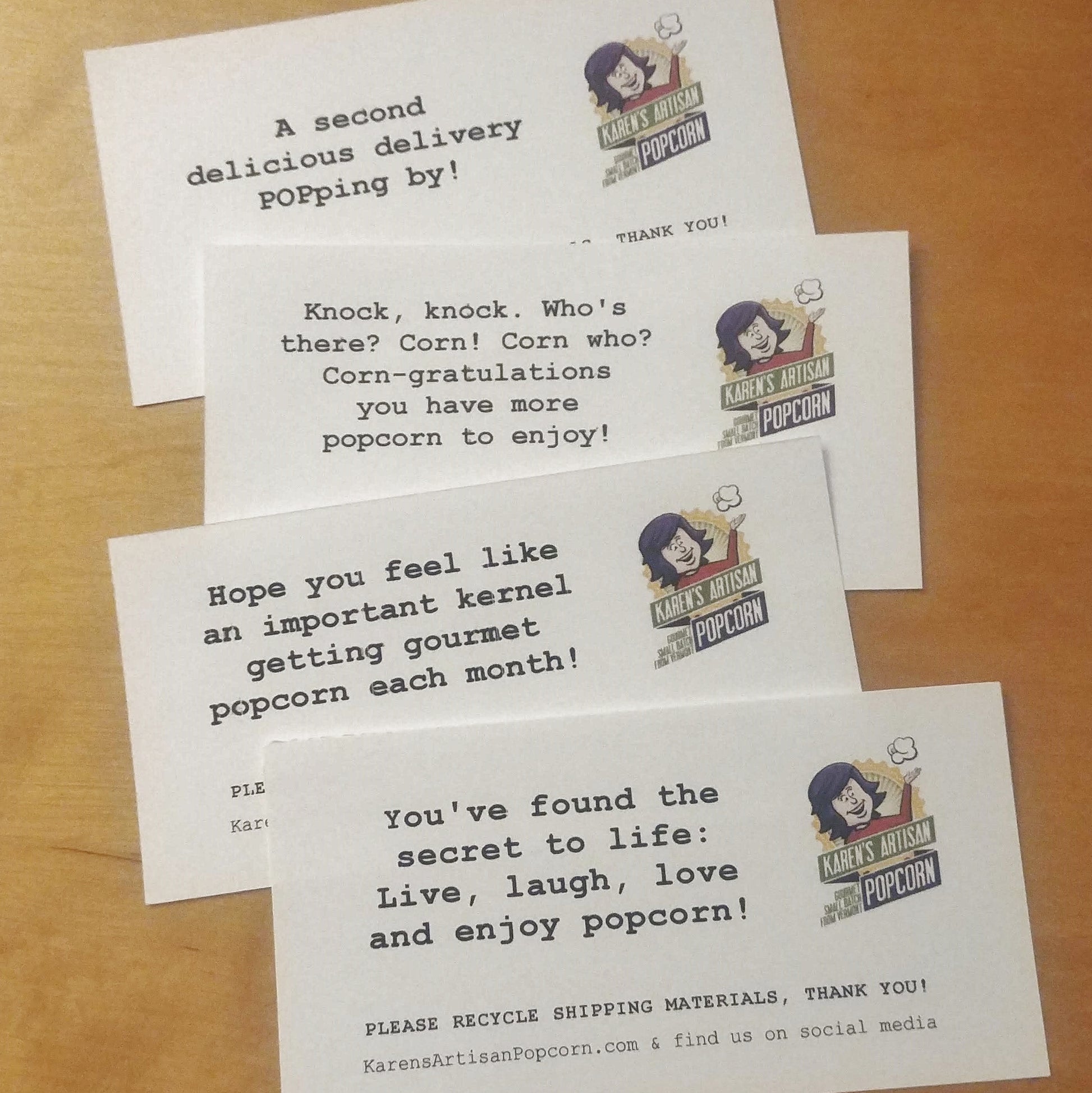 - "Welcome to the Gourmet Popcorn of the Month Club!" card in the first shipment