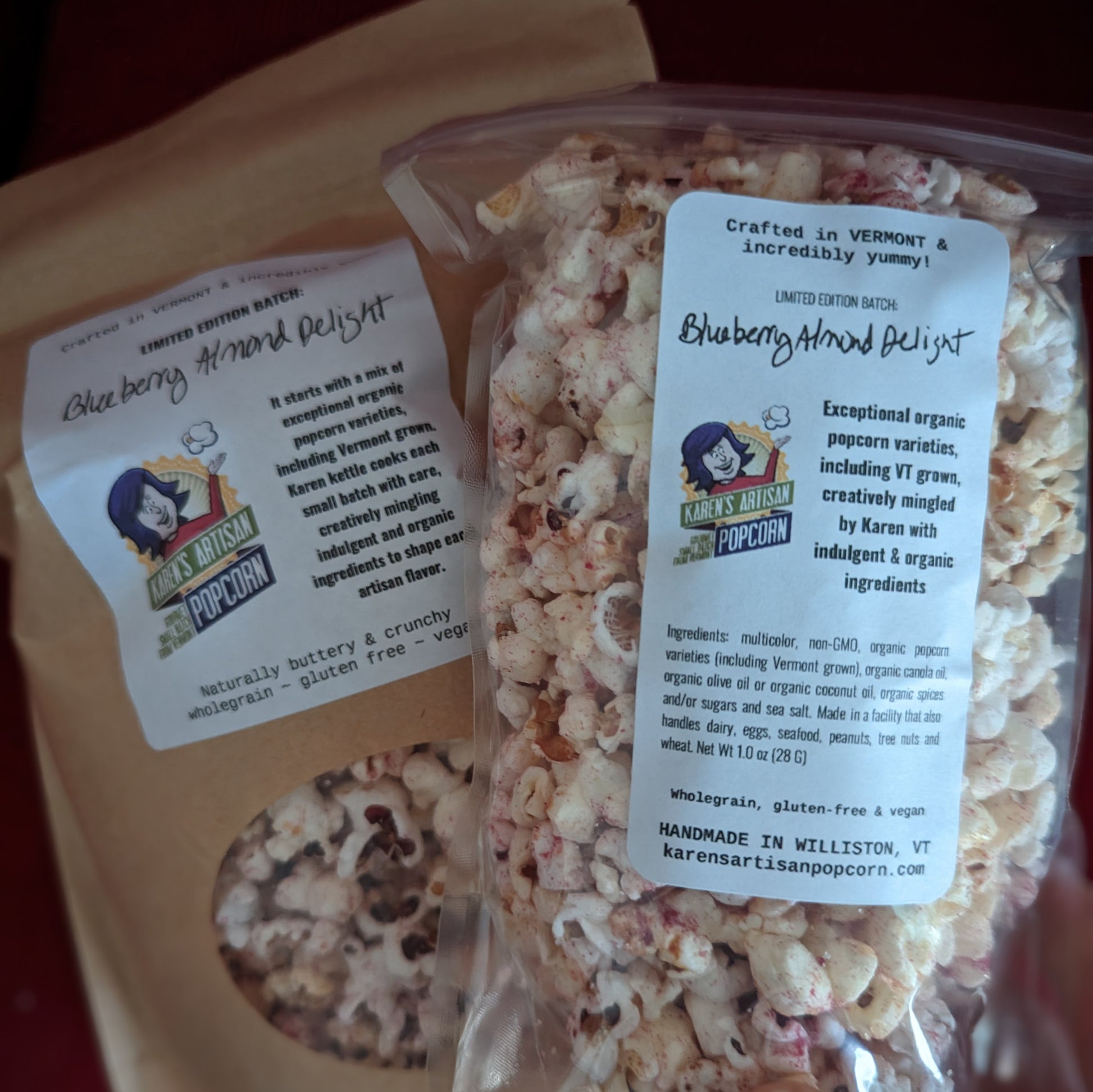 Blueberry Almond Delight -- A sweet and salty kettle corn with delicate almond flavoring, flavorful powdered blueberries and a dash of sea salt.