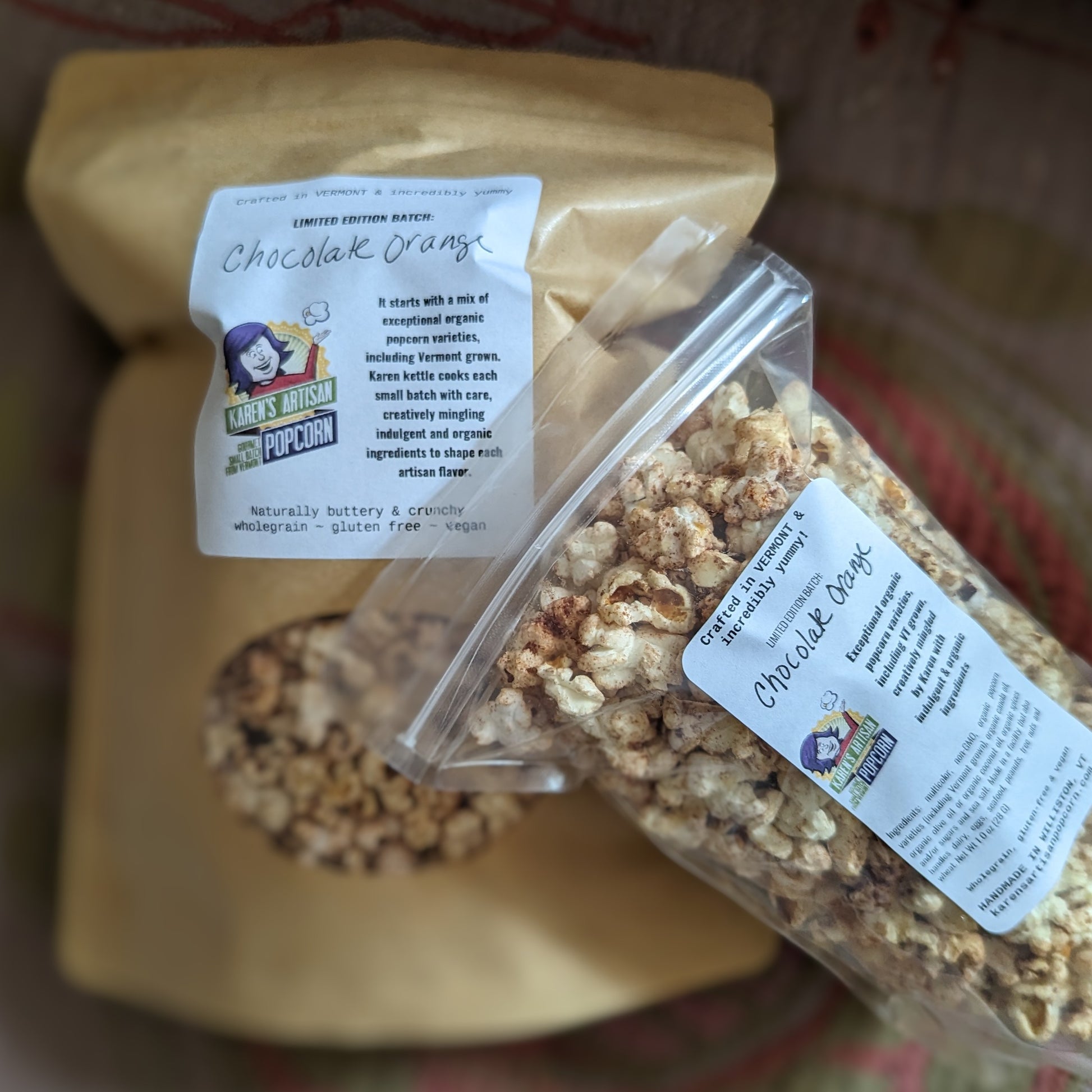 Chocolate Orange -- During my production time earlier this week, I felt inspired to craft a chocolate and orange creation. I adore this flavor combination around the holidays, and although it is the middle of Summer here, it's a wonderful sweet treat. This offering includes organic cacao, organic orange extract, organic cane sugar, organic powdered sugar and sea salt. You’ll notice a delightful blend of dark chocolate and bright citrus tones in this boutique kettle corn recipe.