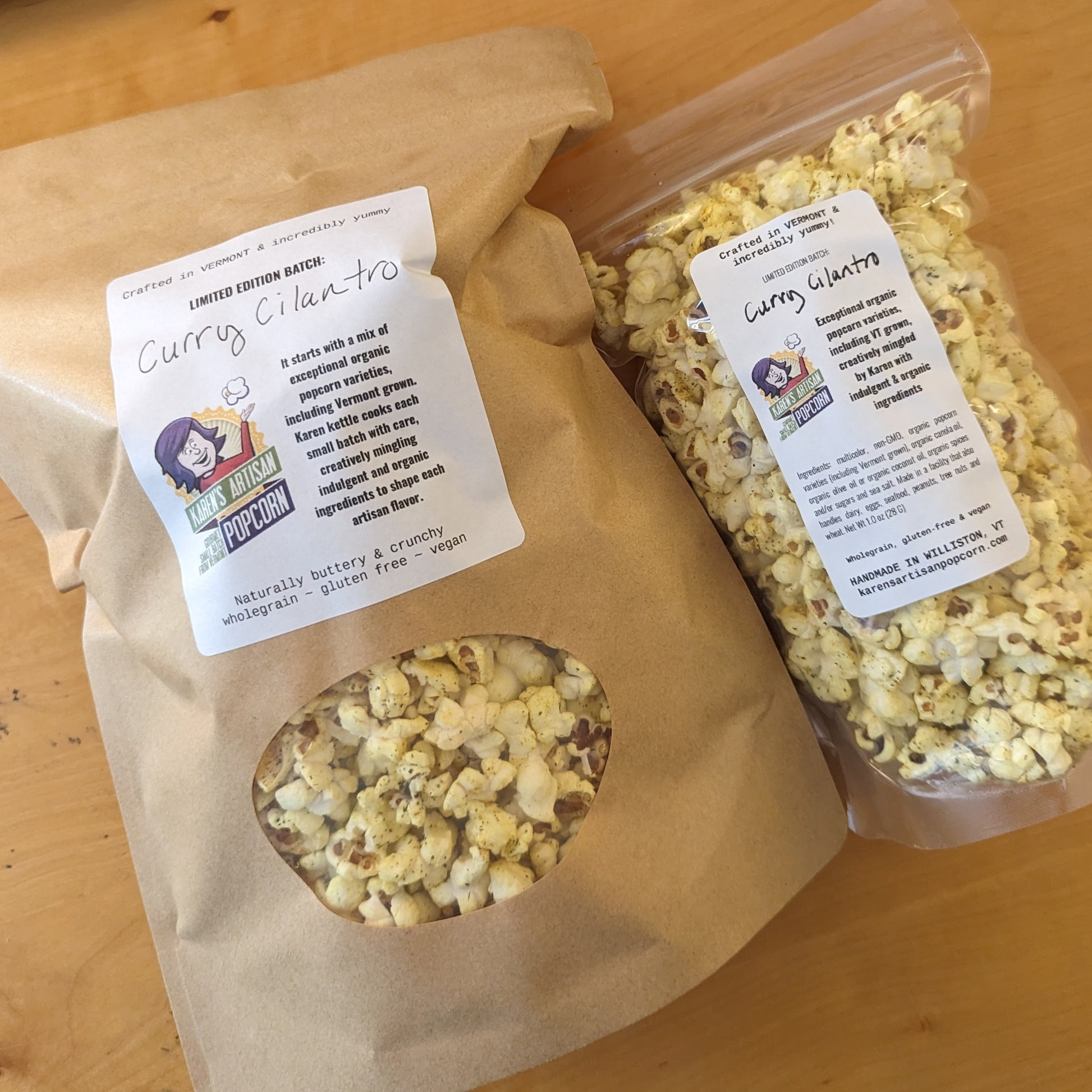 Curry Cilantro -- My naturally buttery popcorn topped with a special organic curry powder blend, organic dried cilantro and sea salt.