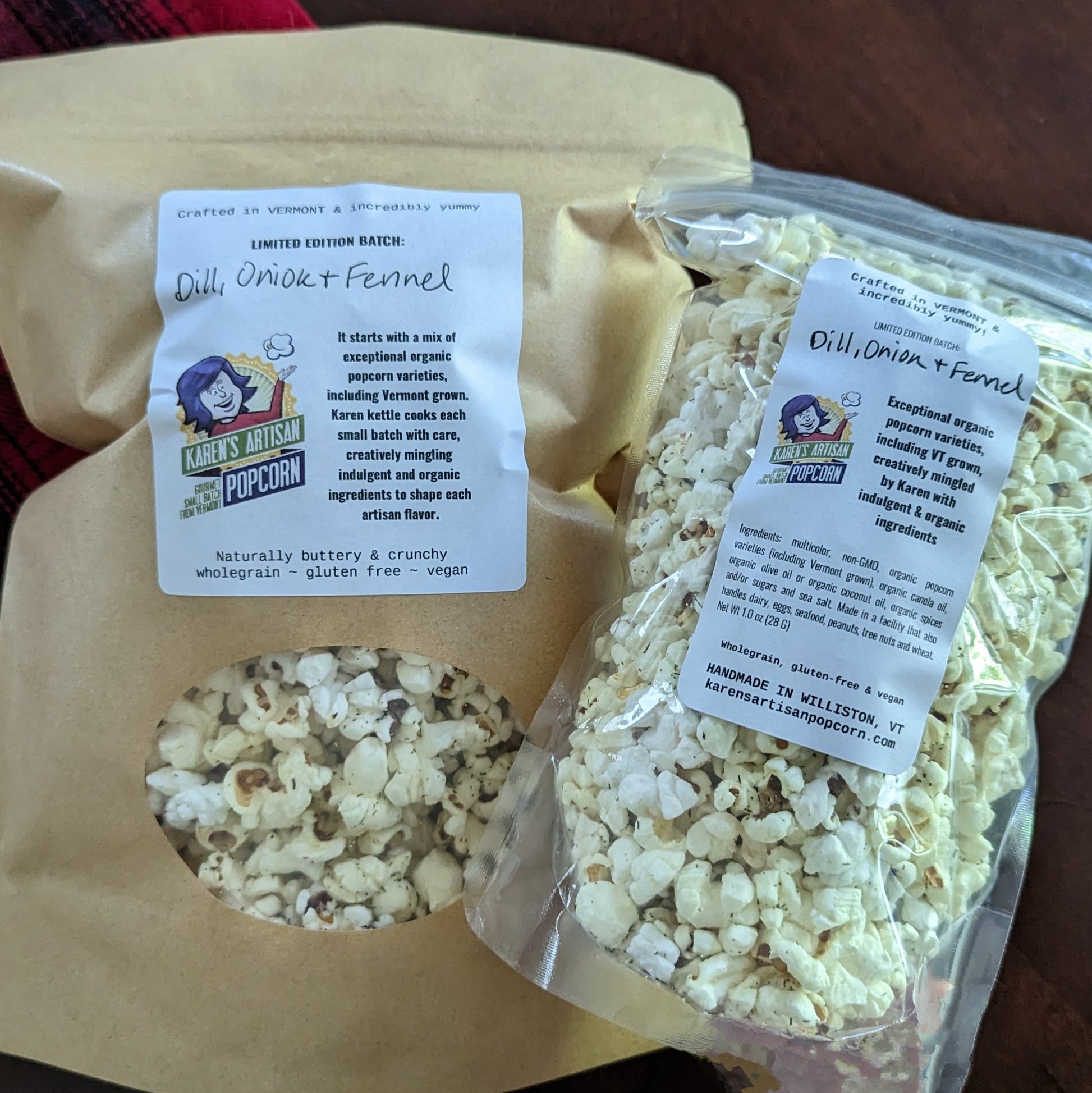 Dill, Onion & Fennel -- Light and Summery with some dill nicely matched with flavorful onion and just the right amount of sweet fennel ending with a natural buttery crunch and dusted with sea salt.