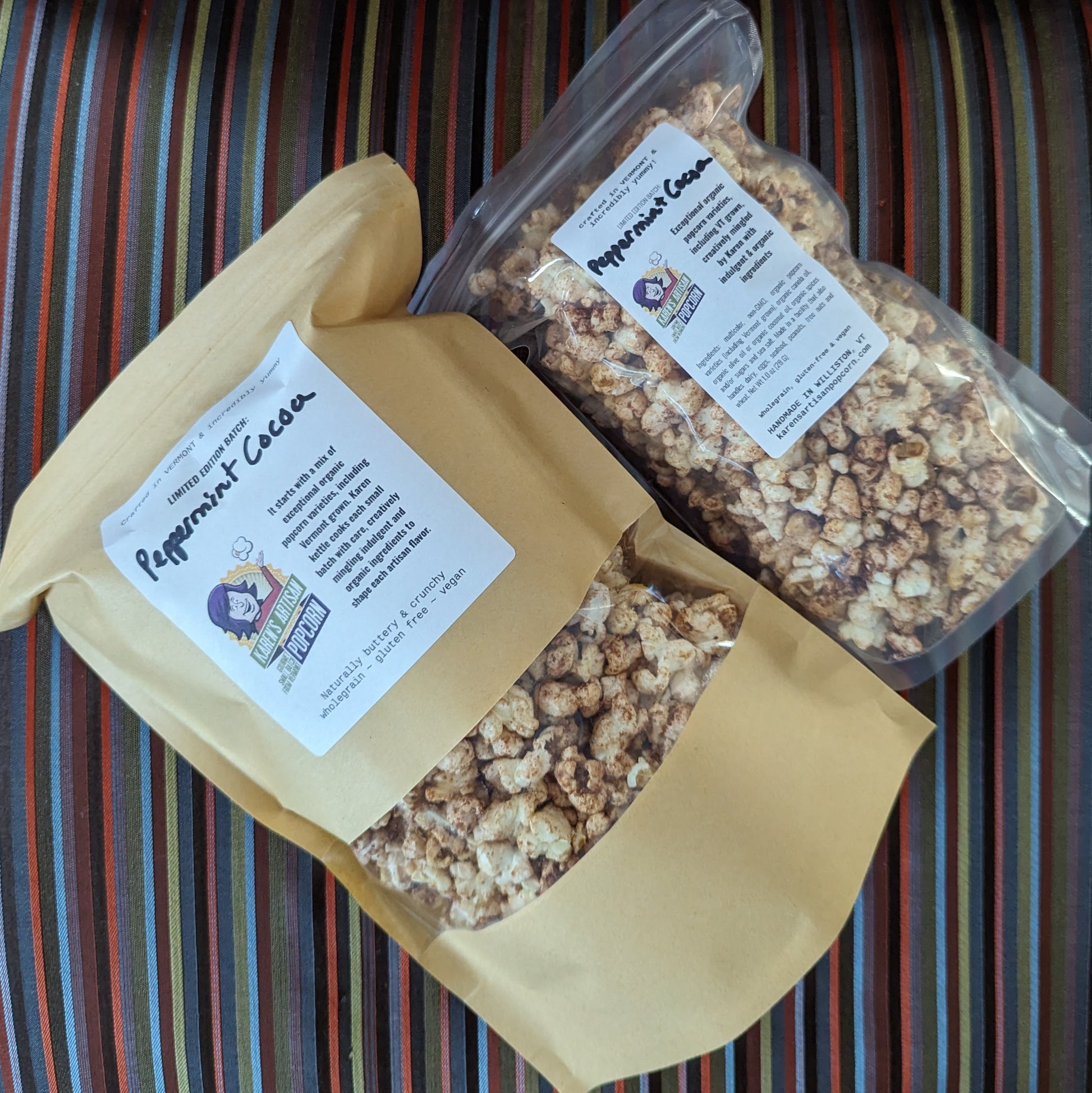 Peppermint Cocoa -- Organic and rich cacao powder mixed with my handmade peppermint sugar and a delicious mix of organic cane sugar and powdered sugar. Of course it has just enough sea salt for that kettle-corn fun. The perfect cozy flavor as we change seasons.