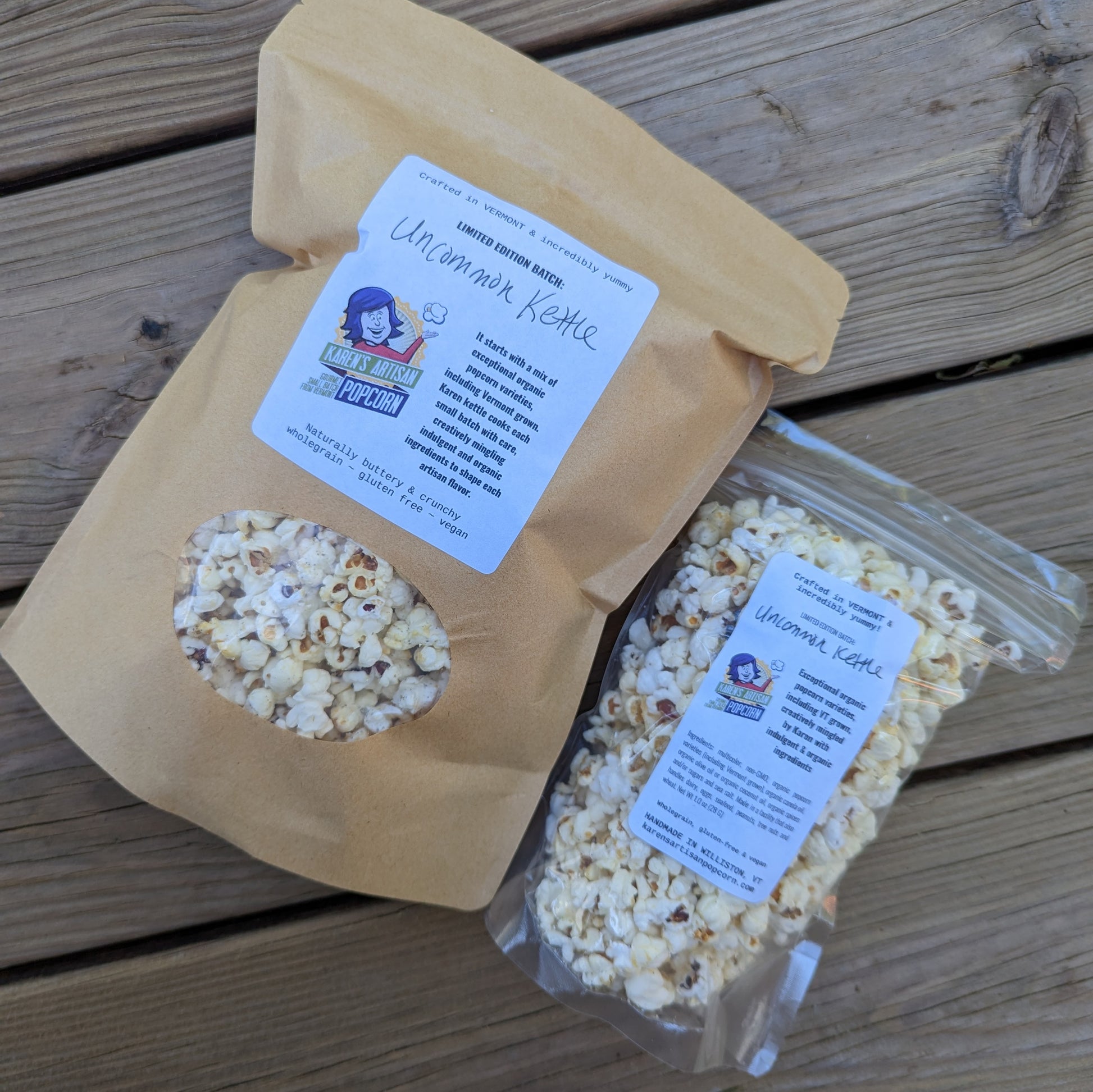 Uncommon Kettle (brown sugar and black salt) -- Gourmet kettle corn with organic brown sugar and lava salt for just the right balance of sweet to salty on top of my naturally buttery popcorn.
