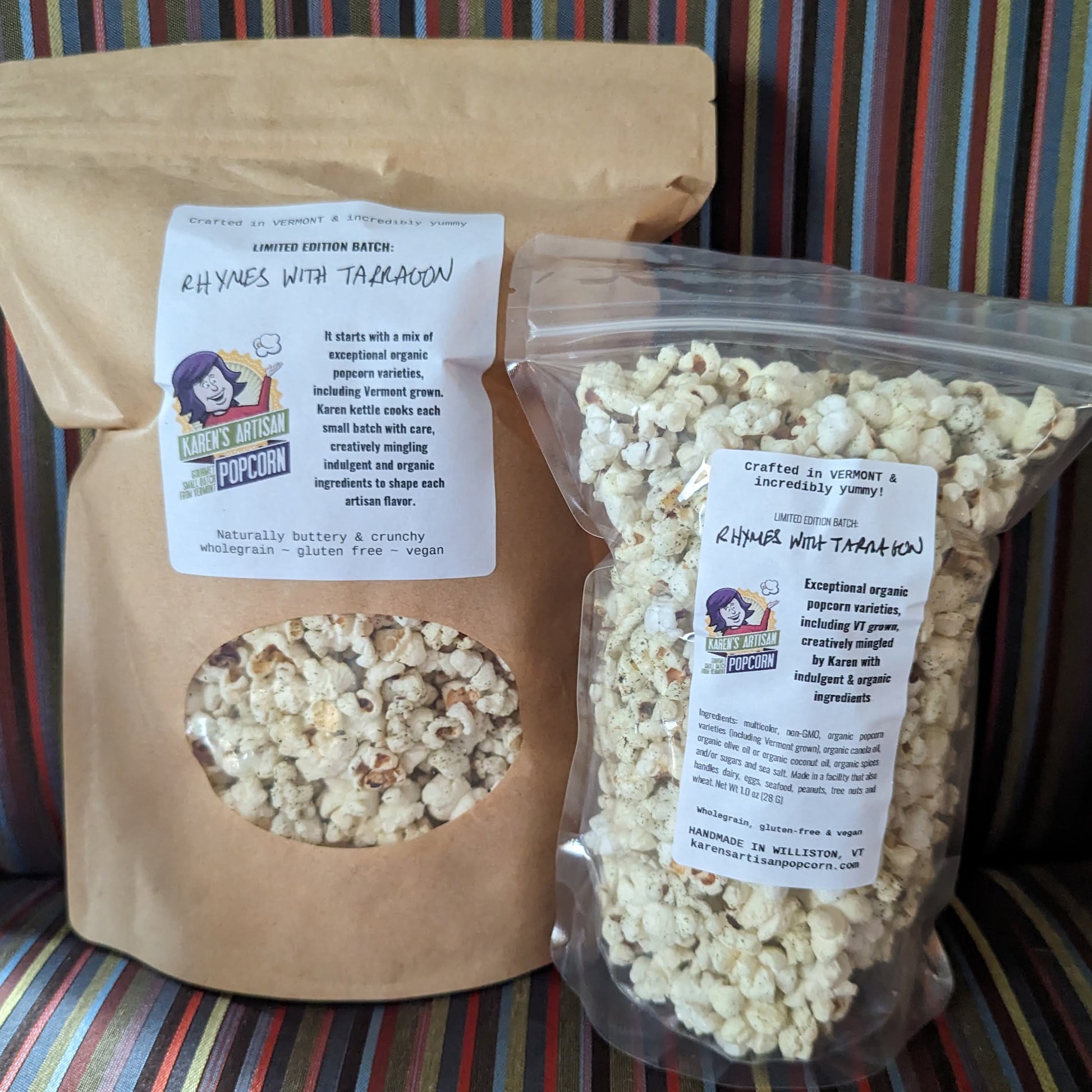 Rhymes with Tarragon -- This week’s flavor leans into classic seasonings and an unexpected addition. The batch’s name, Rhymes With Tarragon, gives away the flavorful complement to the mix, which also features salt, pepper and my trade secrets. If you’re a savory popcorn fan, you’ll adore this limited edition.