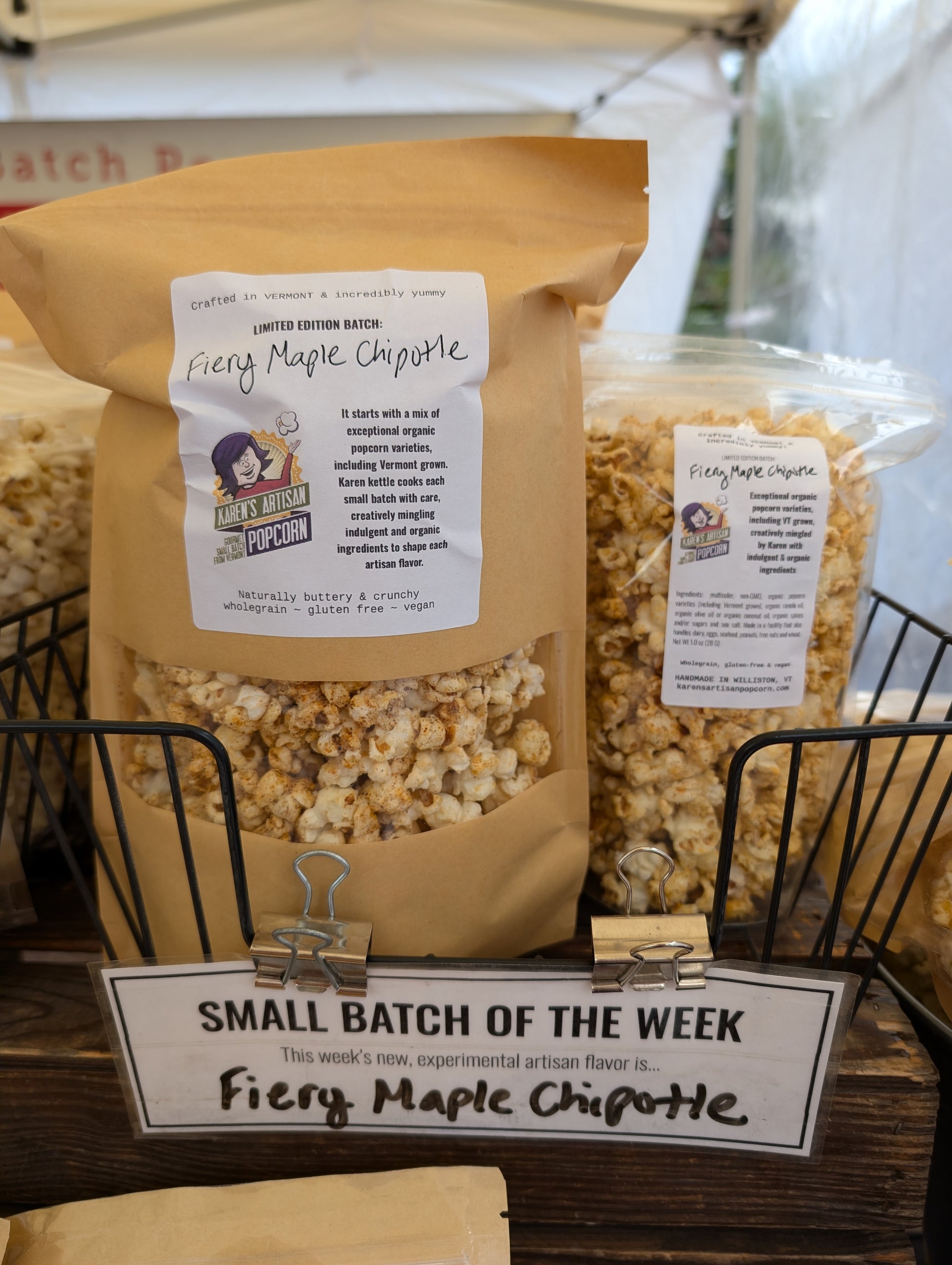 Fiery Maple Chipotle -- Sweet and salty kettle corn with a kick! Three select peppers and three select sugars make up this sweet and spicy flavor: chipotle, cayenne and black pepper paired with Vermont maple sugar, cane sugar and powdered sugar, along with just the right amount of sea salt.