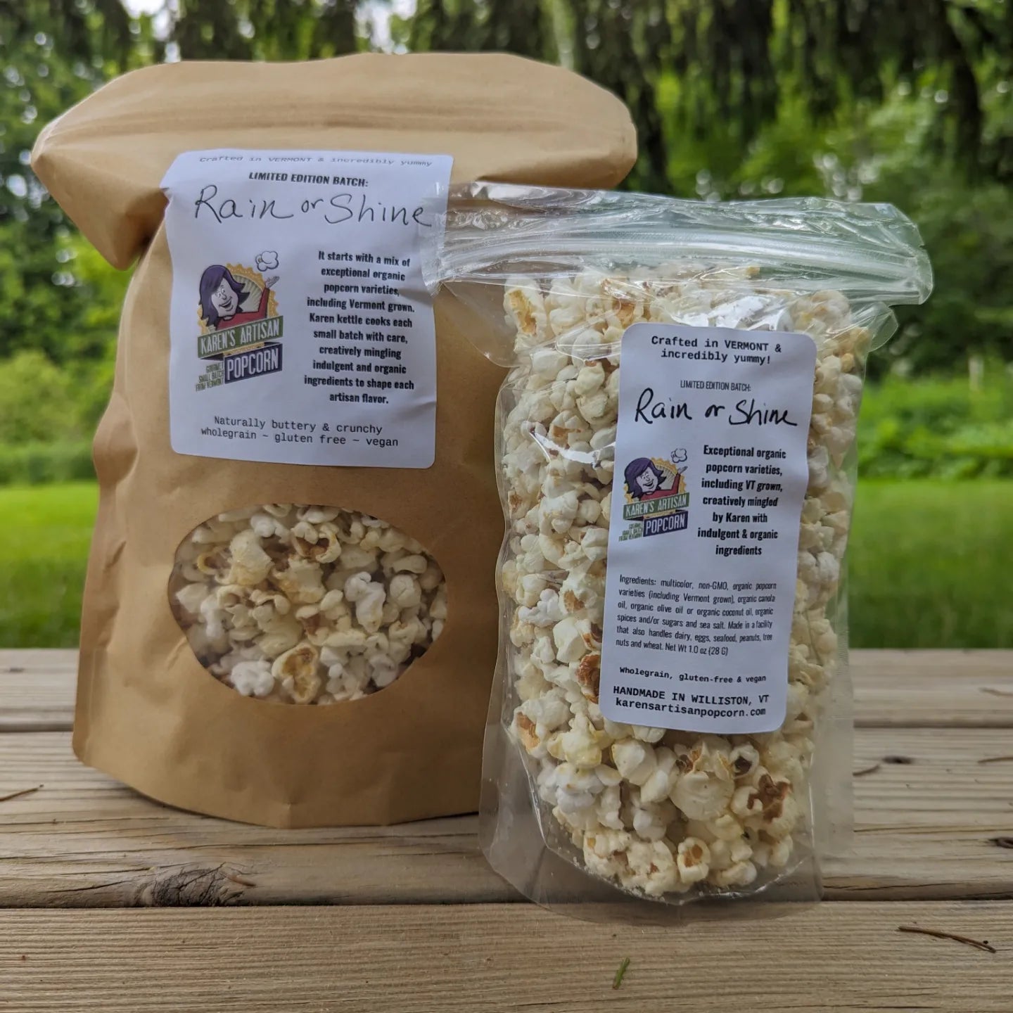 Rain or Shine (smoked sugar and smoked salt) -- Since farmers markets are open rain or shine, like this weekend's markets, this week's flavor is named the same. My organic, rainbow kernel mix is cooked with organic cane sugar and liquid smoked then topped with organic smoked sugar, hickory smoked salt and organic powdered sugar.