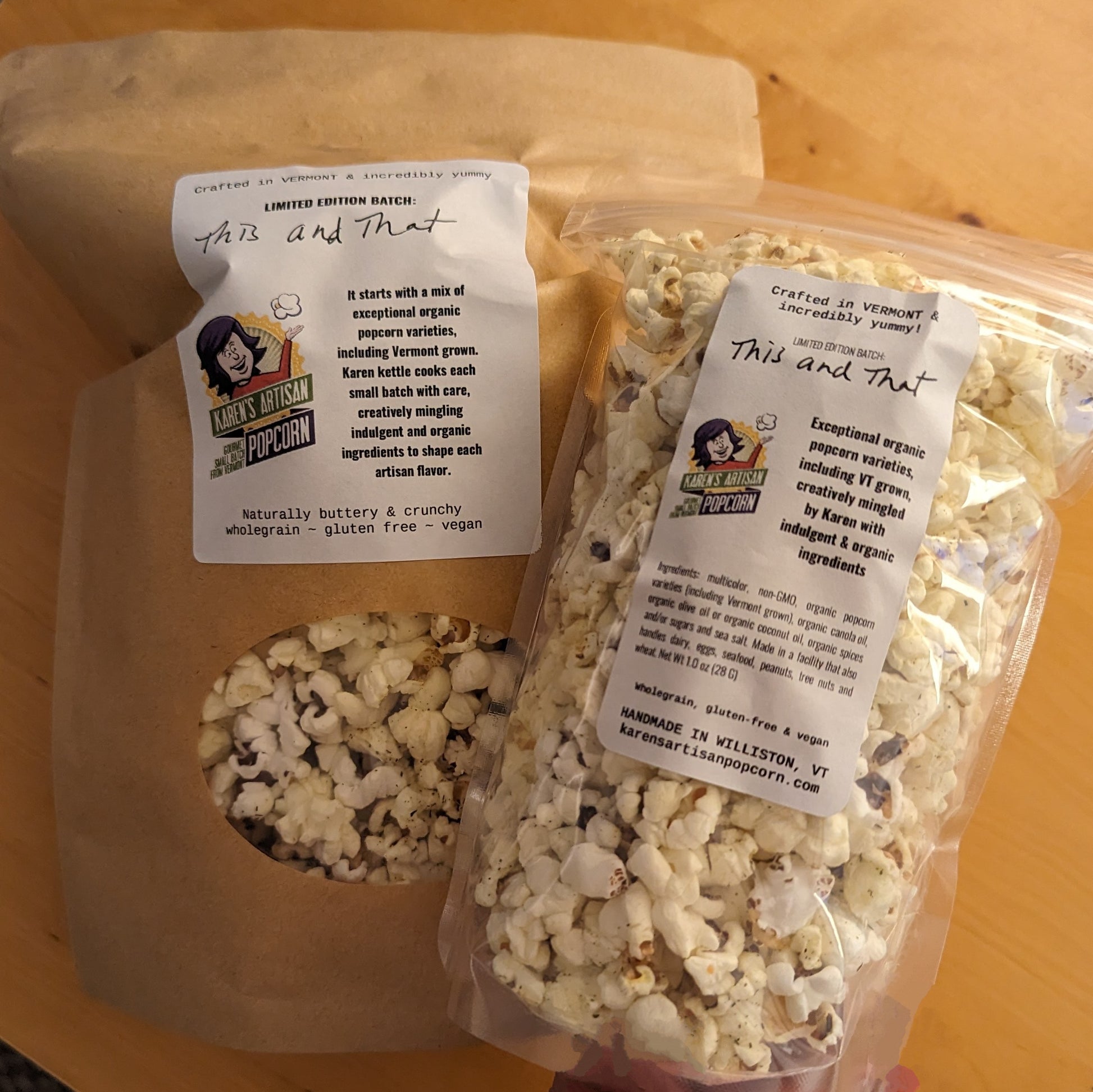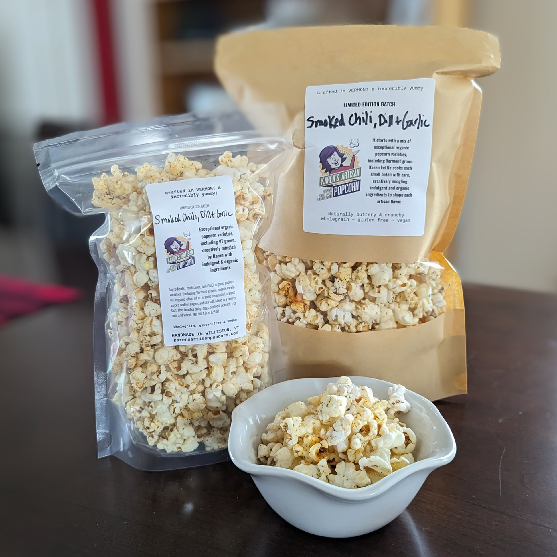 This and That (garlic, chipotle and dill) -- During a creative moment on my production day this week, I artfully blended organic garlic, organic chipotle, organic dill and sea salt into my big popcorn bowl. These are some of our favorite spices to use in our home kitchen so I wanted to see how this combination, or "a little of this and a little of that", turned out on popcorn and I absolutely loved it! I hope you do too!