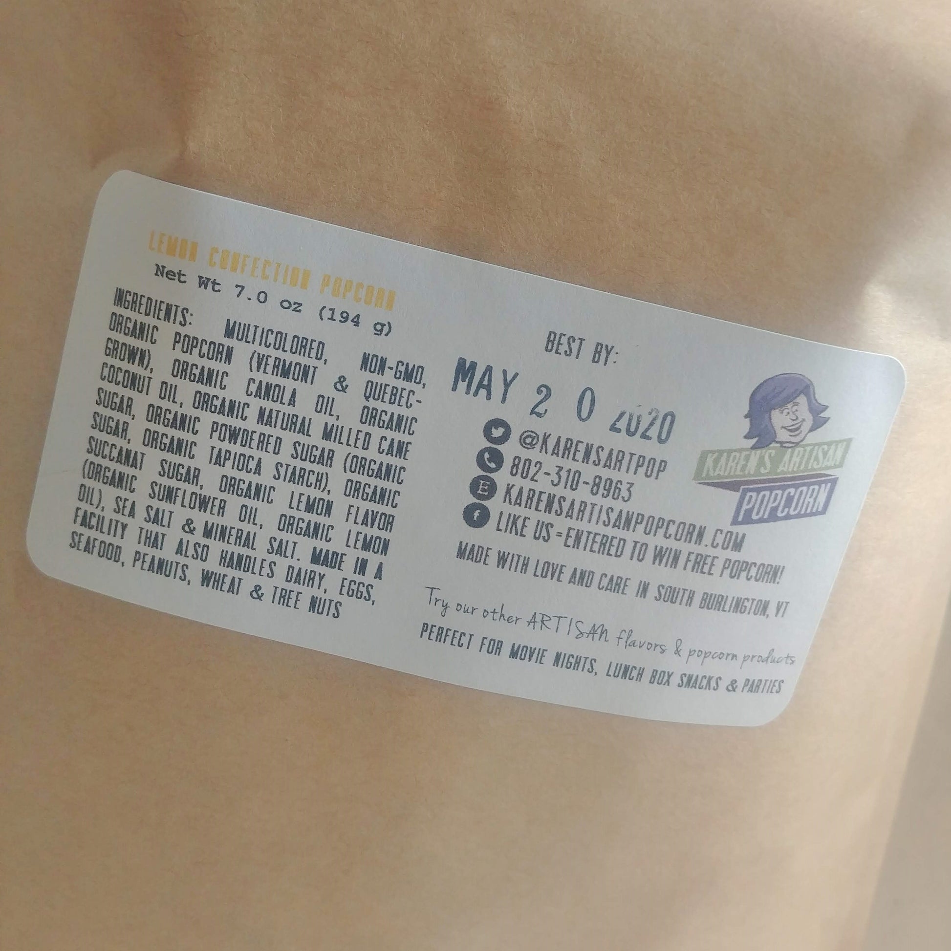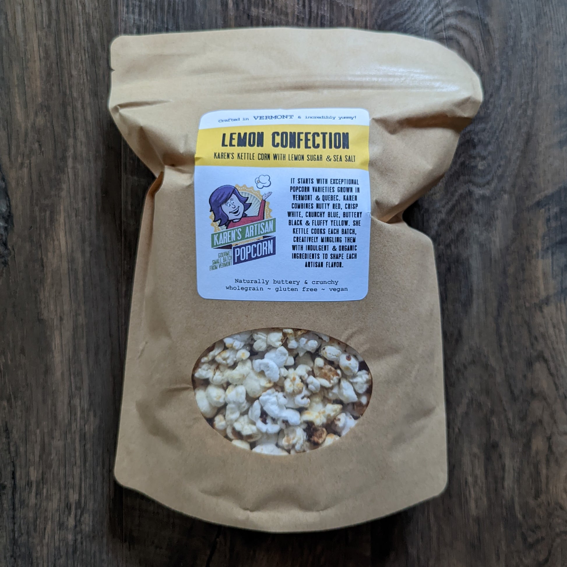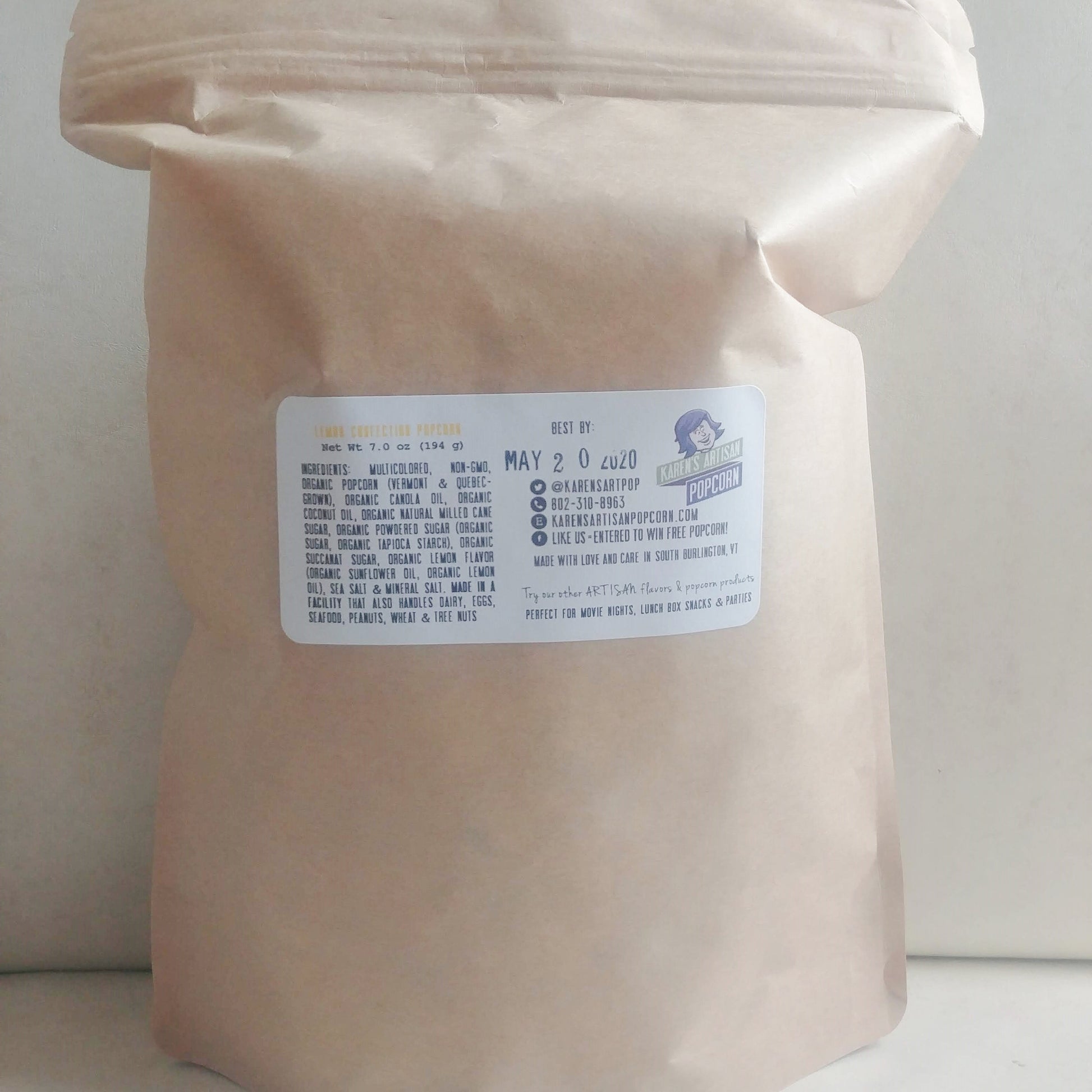 Karen's kettle corn topped with homemade lemon sucanat sugar, powdered sugar & sea salt