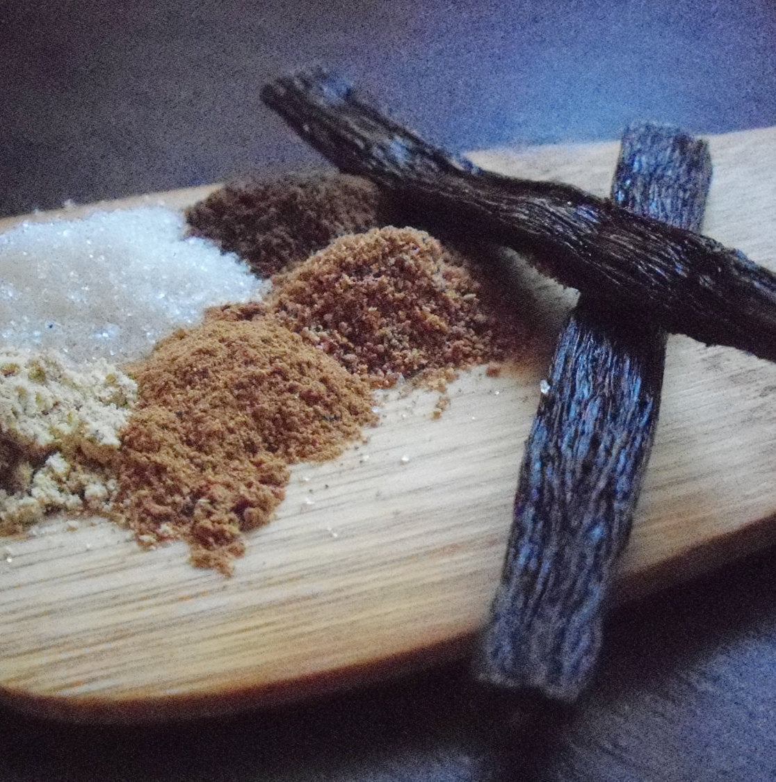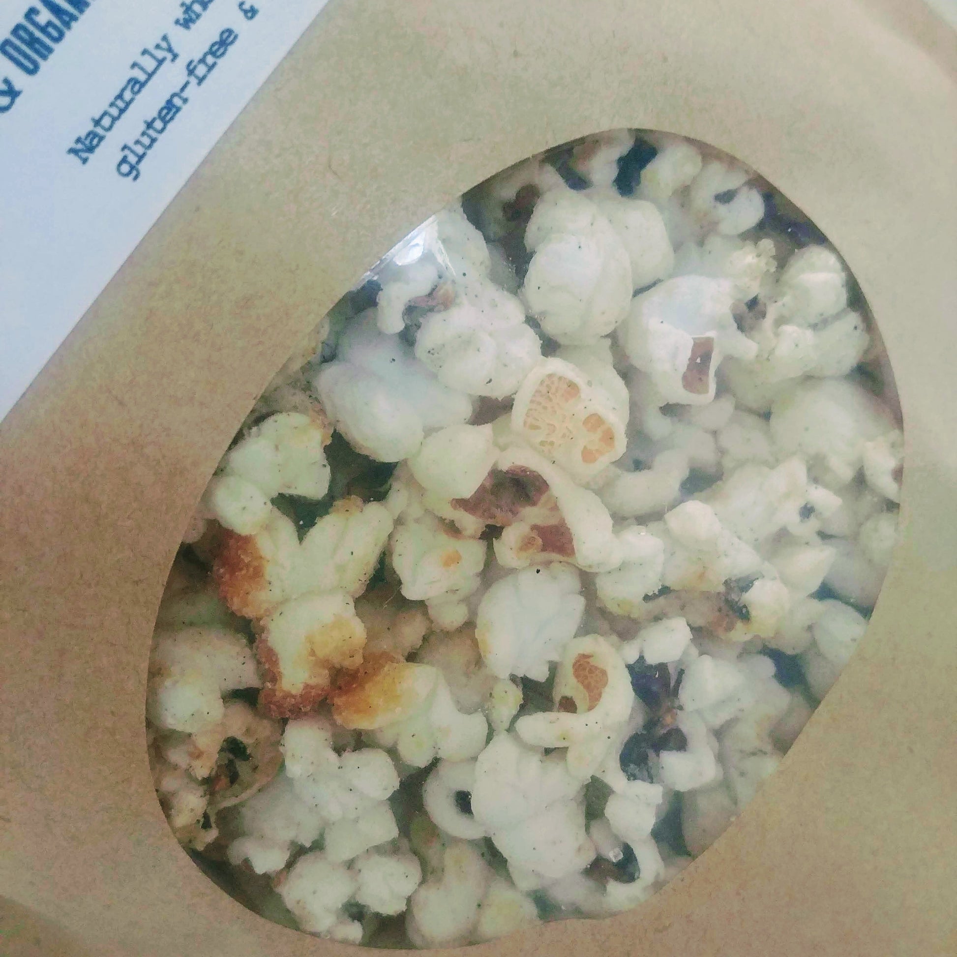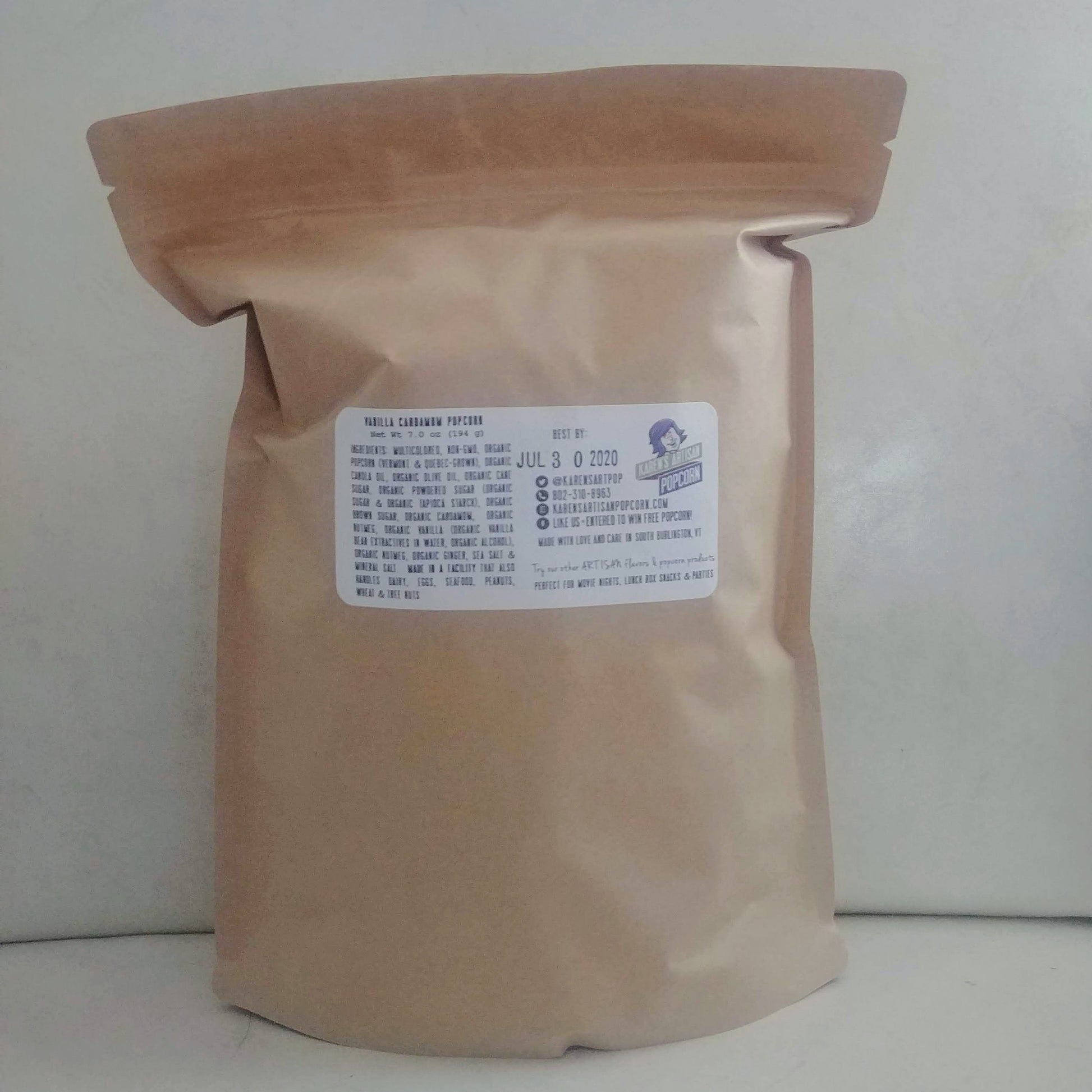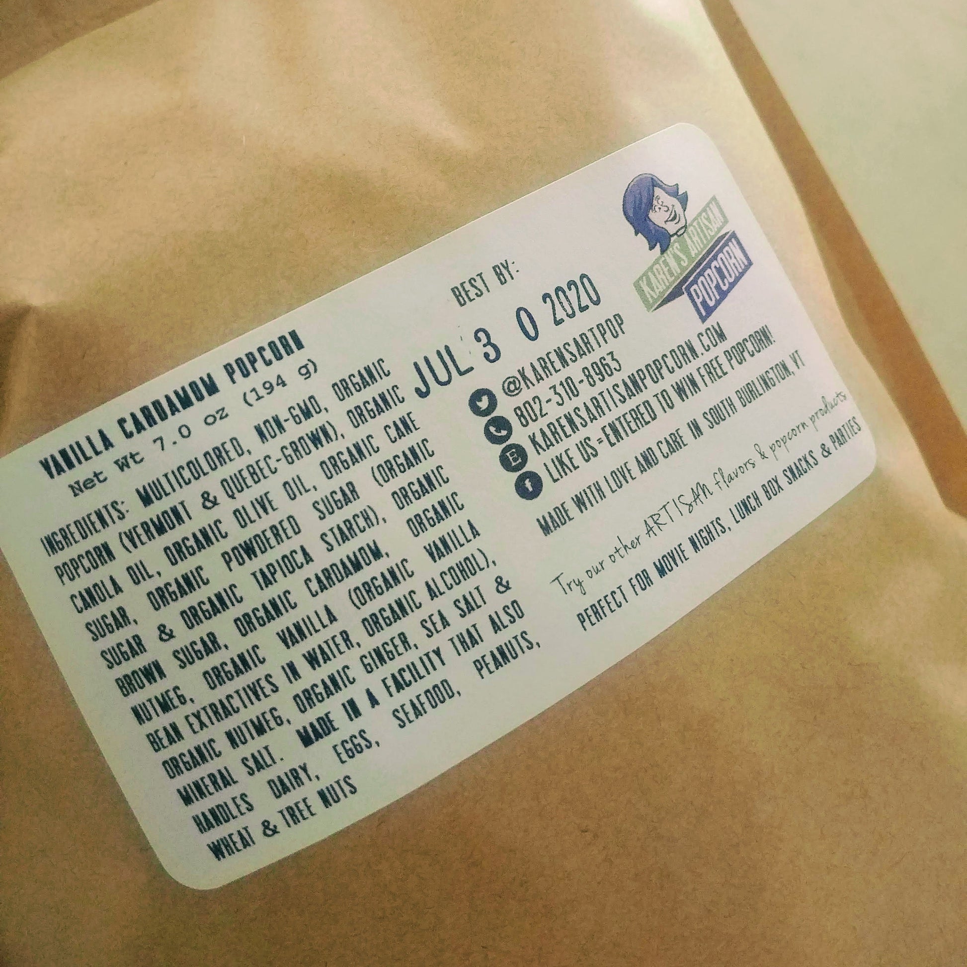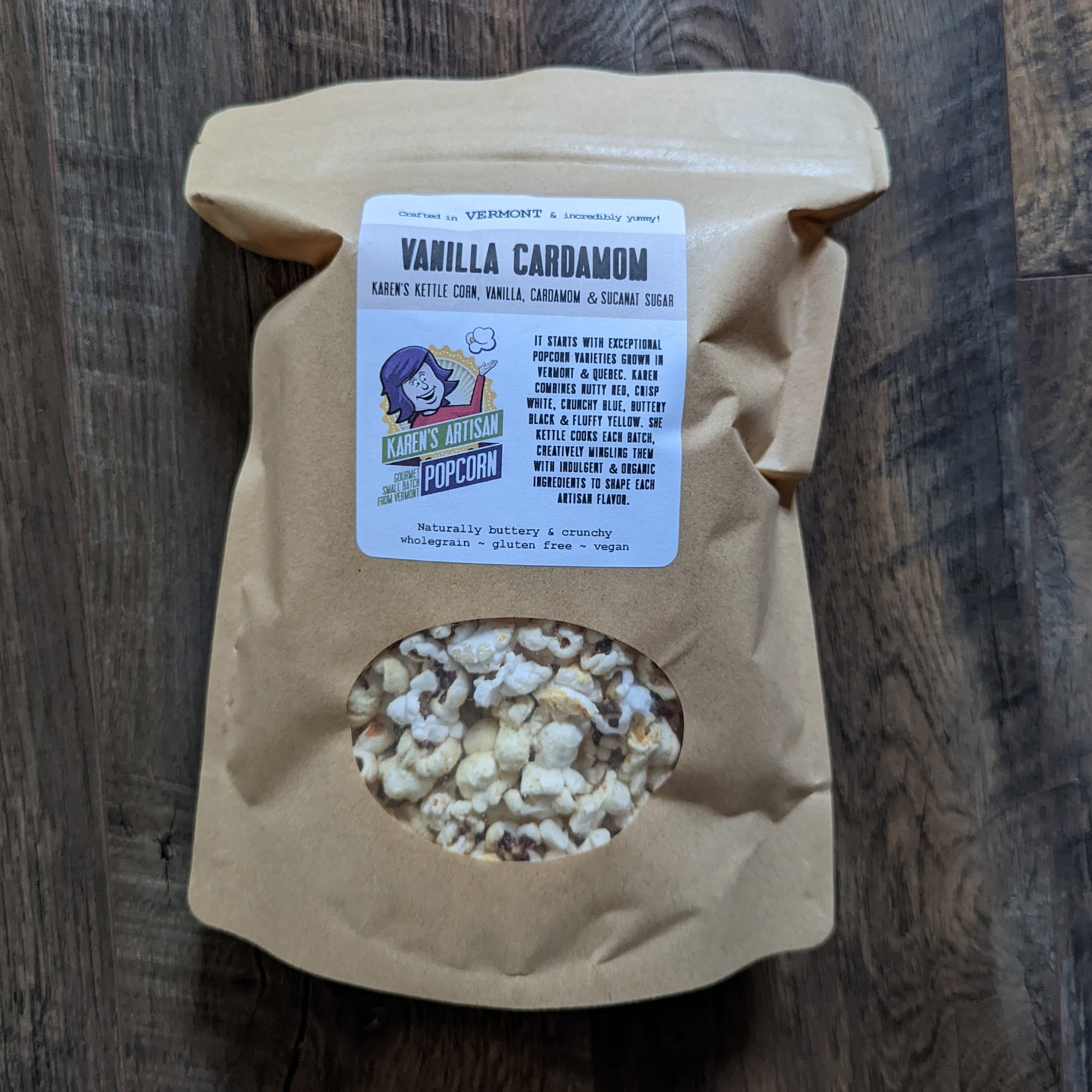 Karen's kettle corn topped with vanilla, cardamom, ginger, nutmeg, raw cane sugar & sea salt